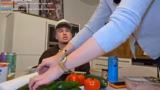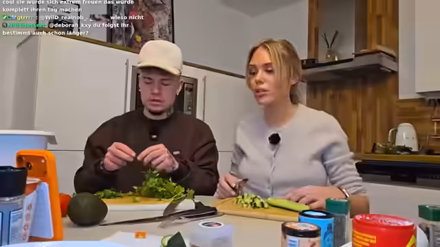 00:19:28Zurück in der Küche beginnt die Zubereitung. Die Gurke, Tomate und Petersilie für den Salat wird fein geschnitten und mit einem Dressing aus Öl, Zitronensaft, Gewürzen und Essig angemacht. Für die Wraps wird das Hähnchenfilet mariniert und anschließend gebraten. Gleichzeitig wird die Avocado für die Guacamole zerdrückt und mit Joghurt, Gurken und Knoblauch vermischt. Die Streamerin freut sich auf das gemeinsame Essen und den geplanten TikTok-Vlog.