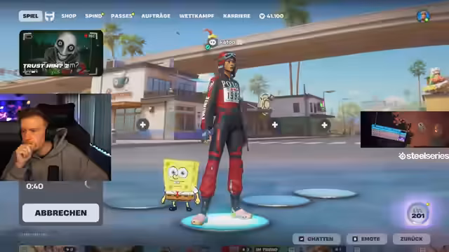 00:09:04Der Streamer geht in eine Battle Royale Map, um ein Item zu verstecken und einem Punkt für den Finder zu vergeben. Er erwähnt, dass seine Mutter den Streamer ebenfalls unterhaltsam findet. Anschließend wird der Wechsel zum nächsten Spiel angekündigt, das ein Format mit einem Glücksrad ist, das über den Loot von Grau bis Mythic entscheidet. Alle Spieler machen sich bereit, die Runden zu spielen und ihre Waffen-Loot zu drehen.