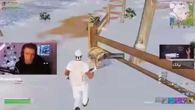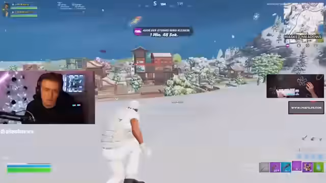 01:52:20Während des Battles wird intensiv nach Materialien und Heilung gesucht. Der Streamer und seine Mitspieler landen in Pleasant Park und bauen eine Skybase. Ein kritischer Moment entsteht, als die Zone so weit von der Basis entfernt ist, dass der Streamer stirbt, bevor er sich heilen oder in die Zone retten kann. Er kritisiert den OG-Modus und das gewählte Spawn-Punkt.