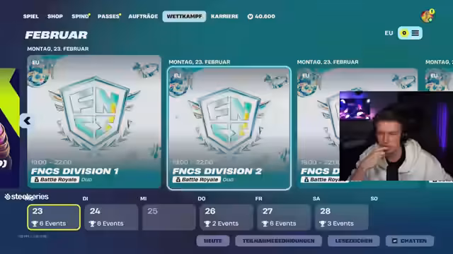 00:02:16Der Stream beginnt mit der Vorstellung des heutigen Programms. Geplant ist ein Duo-Reload als Warm-Up, gefolgt von Solo-Customs. Ein zentrales Highlight ist die Teilnahme an der Reload Elite Series um 19 Uhr, bei der ein Preisgeld von 2,5 Millionen Dollar ausgespielt wird. Der Streamer und sein Partner Maximilian belegten im letzten Qualifier den 170. Platz und streben eine weitere vordere Platzierung an, um sicher in der Runde zu bleiben.