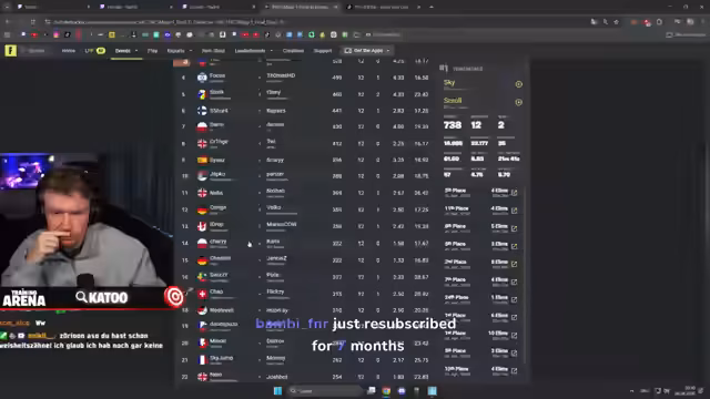 00:00:00Der Stream beginnt mit lockeren Begrüßungen an den Chat, wobei der Streamer seine Freunde und einige Zuschauer beim Namen nennt. Er erwähnt, dass FNCS in 18 Minuten beginnen wird und spricht über seine persönlichen Gewohnheiten wie Joggen. Nachdem er den aktuellen Stand des Leaderboards kommentiert, zeigt sich enttäuscht über einige Performances, besonders von SharkDinner und Swizzy, während er gleichzeitig die konstanten Leistungen von Teams wie Mali und Bukavico würdigt.