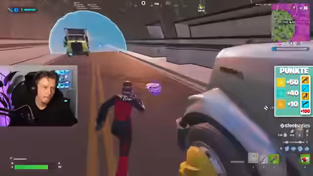 01:18:11Man kann bald Benachrichtigungen für neue Maps und Spiele von einem Crater in Fortnite aktivieren. Es wird ein Spiel gespielt, bei dem es darum geht, einen Bau immer dicker werden zu lassen, bis er platzt. Der Streamer probiert ein Spiel aus, bei dem man eine Wand zumachen kann. Es wird ein Spiel gespielt, bei dem man auf Rollen stehen bleiben muss.