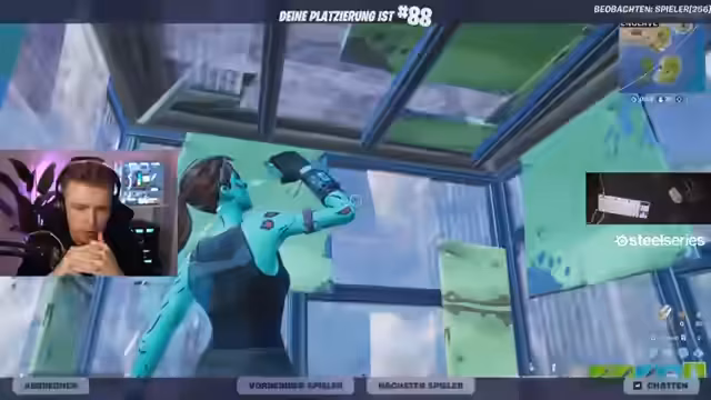 00:52:51Auch im Finale des Input-Switch Battles kämpft der Streamer mit der ungewohnten Steuerung. Er erleichtert sich die Situation mit Slurfsäften, um schneller agieren zu können. Obwohl er taktisch vorgeht und eine Basis errichtet, zeigt seine Bewegung insbesondere bei Impulssprüngen Unbeholfenheit. Die Runde endet für ihn im Kampf gegen Rubix, der ihn nach einem knappen Duell eliminiert.