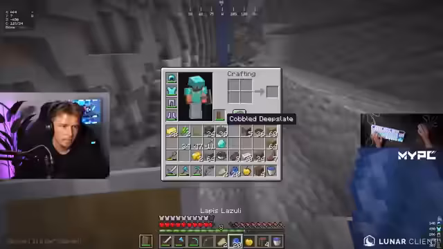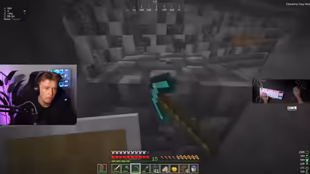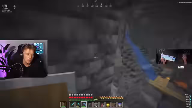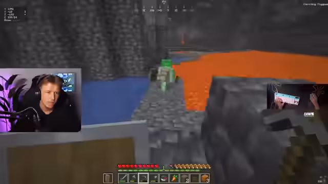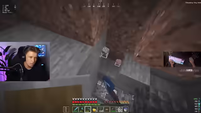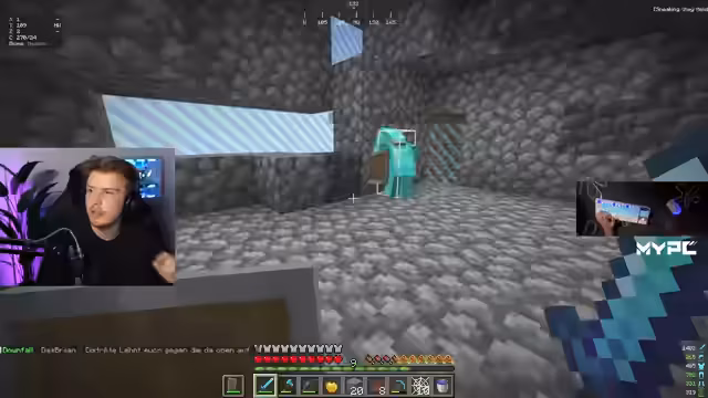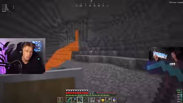 06:20:50Die Streamer erkunden eine Höhle und diskutieren über den Abbau von Ressourcen. Einer der Streamer schlägt vor, Türen am Boden zu platzieren, um darin atmen zu können, was als Luftloch dient. Sie bauen Äxte und Spitzhacken, wobei sie feststellen, dass Gold nur mit bestimmten Werkzeugen abgebaut werden kann. Unterwasser ist die Sicht schlecht, weshalb einer der Streamer Fullbright aktiviert. Sie finden Fisch und Gold, hören ein Skelett und vermuten, dass die Höhle tiefer geht. Karotten werden gegessen, Eisen und Gold werden gefunden und abgebaut. Einer der Streamer hat Türen und atmet regelmäßig ab. Lava ist in der Nähe und eine Spinne wird gehört. Sie bauen sich langsam nach unten und stoßen auf Deep Slate und Wasser. Plötzlich entdeckt einer der Streamer Diamanten.