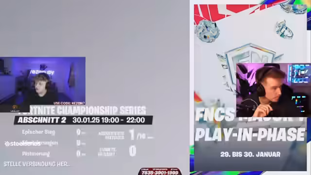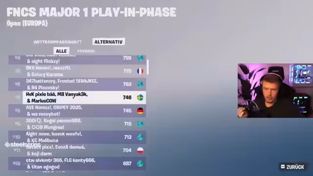 00:00:31Der Stream beginnt mit der Ankündigung einer Viewing Party für die FNCS Heats Qualifier. Es werden mehrere bekannte europäische Teams und Spieler genannt, darunter Schmali, Neo, Finny und Memo, sowie Asa, Faded Pigion und Redash. Streamer wie Heichi, Luke und Taichi werden ebenfalls erwähnt, wobei Taichi mit schlechten gestrigen Punktzahlen (40 Punkte) unter besonderem Druck steht, um die Qualifikation zu schaffen. Der Streamer begrüßt das Chat und kündigt an, die besten Spieler im Auge zu behalten.