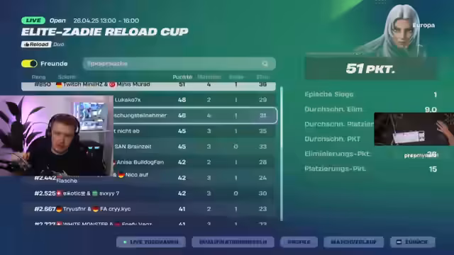 00:07:20Während des Cups äußert der Streamer erhebliche Frustration über das Hidden Matchmaking-System. Er erklärt, dass die Wartezeiten für Runden extrem lang sind, oft über eine Minute, obwohl das Turnier Tausende von Teilnehmern hat. Er vermutet, dass Gegner nach Divisions gepaart werden, was dazu führt, dass er auch bei null Punkten gegen starke Spieler antreten muss, was er für unfair und künstlich hält. Dies führt zu einer emotionalen Diskussion über die Sinnhaftigkeit von Reload-Cups.