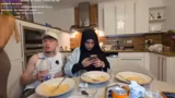 00:56:03Das Gericht ist fast fertig. Die Nudeln werden abgeschöpft und mit dem Hähnchen-Gemüse-Mix in einer großen Pfanne vermischt. Die Streamerin fügt Sahne hinzu, um die Sauce cremiger zu machen. Der Countdown zum Iftar, dem Ende des Fastens, läuft. Als es soweit ist, wird das Fasten mit Wasser und Datteln gebrochen, wobei das traditionelle Bismillah gesprochen wird. Das Essen wird als lecker und gelungen bezeichnet.
