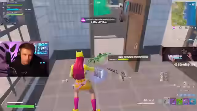 03:17:55Das Stream-Setting ist das Spiel Fortnite. Der Fokus liegt auf der aktiven Jagd auf Gegner und dem Sammeln von Ausrüstung. Der Sprecher erkundet die Karte, trifft auf Gegner und versucht, sie mit Granaten und anderen Waffen zu eliminieren. Es werden verschiedene Spieler erwähnt, wie Carrey, Biko und Tachi, was auf ein dynamisches und teamorientiertes Spiel hindeutet. Der Sprecher ist bestrebt, gute Gegenstände wie Ligi und Pumpen zu finden, und äußert sich über Spielmechaniken und strategische Entscheidungen, wie das Erkennen von Gegnern durch einen Scanner.