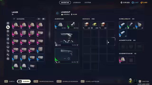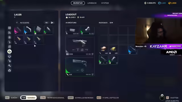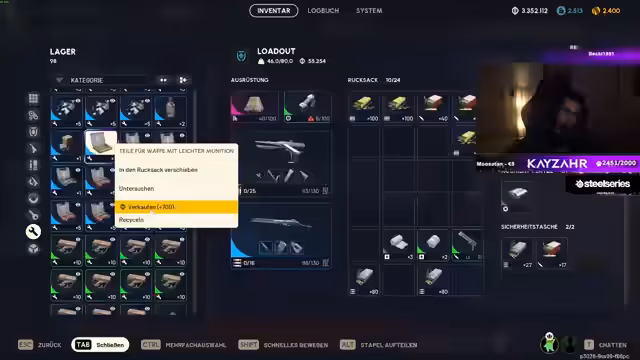 02:20:09Nach einer erfolgreichen Extraction mit 77K Loot wird die Verwaltung des Inventars thematisiert. Es wird entschieden, viele der gesammelten Gegenstände direkt zu verkaufen, da sie nicht für aktuelle Quests benötigt werden. Das Crafting von Granaten wird als wichtig erachtet, da diese als sehr stark beschrieben werden. Es wird überlegt, wie man Rohstoffe wie Sprengstoff durch Recycling erhalten kann. Das Lager wird geleert, um Platz zu schaffen, und es werden neue Loadouts für weitere Runden vorbereitet, darunter eine Kettel 4 und eine Faro 4. Die Effizienz des Craftings mit Maus im Vergleich zum Controller wird hervorgehoben. Es wird eine neue Runde im Raumhafen-Event gestartet, um auf Jagd zu gehen, wobei die Schwierigkeit des PvP-Kampfes gegen andere Spieler, die anstatt der Maschinen zu bekämpfen, betont wird.