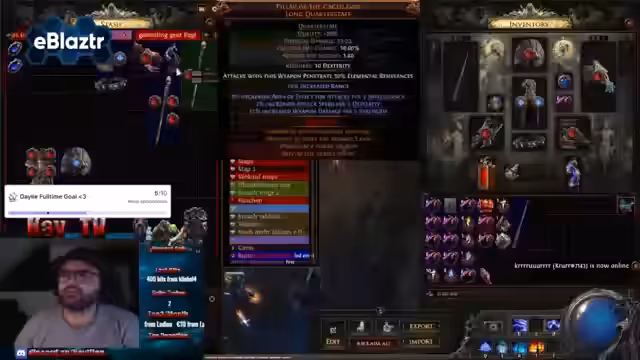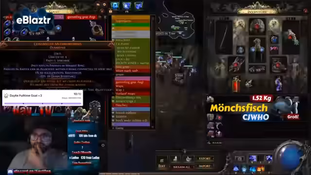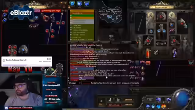 00:00:00Der Streamer startet pünktlich und begrüßt seine Zuschauer. Er kündigt ein großes Giveaway im Wert von 800 Divine an, bei dem er ein komplettes Set an Ausrüstung verschenken wird. Dazu gehören unter anderem eine legendäre Flasche, ein Helm, Gürtel, Schuhe, Halskette, zwei Waffen, diverse Juwelen und eine Hand für einen Gambling-Build. Alle Zuschauer haben die gleiche Chance zu gewinnen, der einzige Teilnahmekriterium ist das Ausrufen eines Angeleins im Chat.