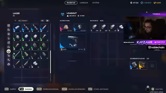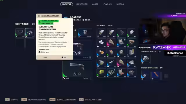 01:01:10Nach einer erfolgreichen Runde steht das Inventar voller Beute. Streamer sortiert und bereinigt seinen Lagerplatz, indem er nicht benötigte Gegenstände verkauft oder recycelt. Er tauscht seltene Baupläne aus und plant seine zukünftigen Ausrüstungen. Der Fokus liegt auf der Optimierung des Inventars und der Vorbereitung für die nächste Runde.