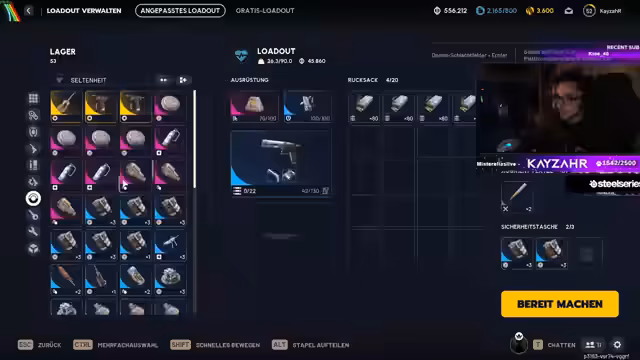 04:17:25Der Streamer interagiert intensiv mit dem Chat, nennt Viewer bei Namen und bedankt sich für Spenden und Abonnements. Er diskutiert darüber, wie viel Loot er in seiner Taschentragevorrichtung (Rucksack) transportieren kann und was er behalten oder verkaufen soll. Er kündigt an, überschüssige Gegenstände wie Waffenteile zu recyclen, um bessere Teile zu craften. Dabei geht er auf die unterschiedlichen Waffen wie Venator und Boletta ein und vergleicht deren Stärken und Schwächen auf verschiedenen Distanzen.