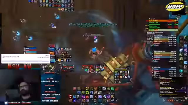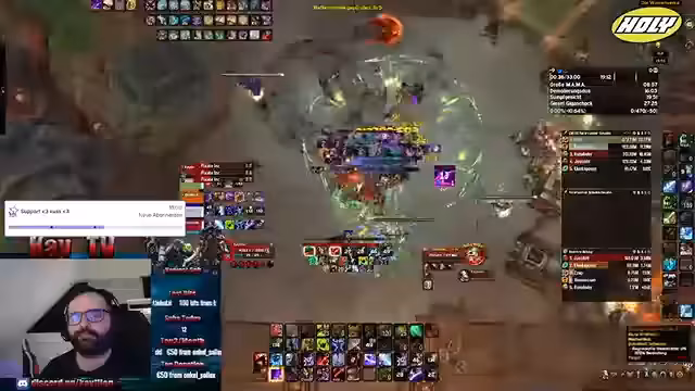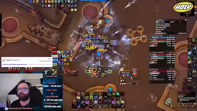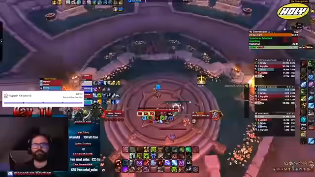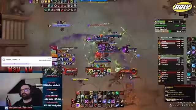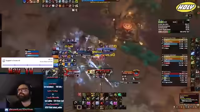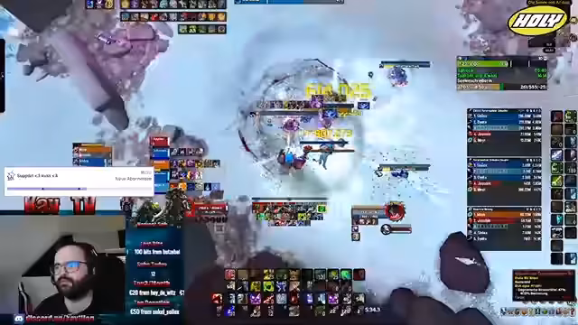02:42:47Zu Beginn des Streams werden Zuschauer aktiv zum Gewinn eines goldenen Drachen aus dem Shop aufgerufen. Im selben Atemzug wird das Gameplay fortgesetzt und es werden laufende Herausforderungen in einem Mythic+-Key beschrieben. Der Streamer kommentiert den Verlauf des aktuellen Runs, erwähnt teils unkoordinierte Aktionen im Chat und benennt technische Makros, die angeblich nicht mehr funktionieren.