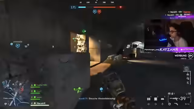 02:52:51Nachdem sein Team den Sektor A verloren hat, wechselt der Streamer die Klasse und spielt nun einen Sanitäter. Er hebt die Stärke der KTS-100 LMG hervor und kritisiert das unkoordinierte Vorgehen des eigenen Teams, insbesondere der Panzercrew, die nicht Druck auf den feindlichen Sektor ausübt. Er betont die Wichtigkeit von Smokgranaten, um sicher vorzustoßen, und versucht vergeblich, einen Spawnsender zu platzieren, um das Team zu einem koordinierten Angriff zu bewegen.