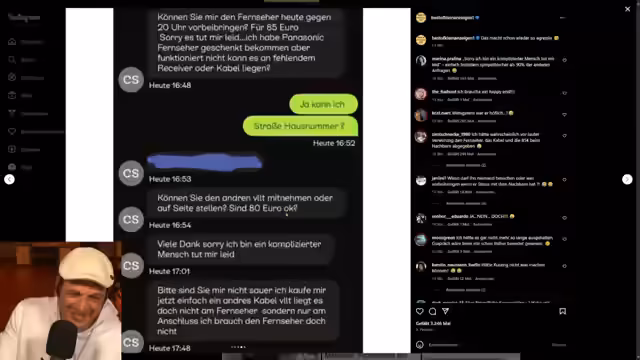 02:42:44Ein Höhepunkt des Streams ist eine besonders absurde Konversation zwischen zwei Personen auf eBay Kleinanzeigen. Es geht um den Verkauf eines Autos, wobei der Käufer unerwartet den Ausdruck 'kotzen' wiederholt verwendet. Der Streamer liest diese Wechselrede vor und findet die eskalierende, scheinbar sinnlose Konversation extrem witzig, die in einem 'Kotzen-Emoji-Battle' gipfelt und mit einem abrupten Ende des Chats endet. Diesen humorvollen Vorfall kommentiert der Streamer anschließend.