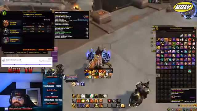 03:30:33Die Aktivitäten verlagern sich in das Retail-Spiel von World of Warcraft. Der Streamer bereitet einen mythischen Schlüssel vor, merkt aber an, dass er aufgrund von Hunger und Müdigkeit erst nach einer Kochpause und einem Powernap weitermachen wird. Er plant, später am Abend noch einige weitere mythische Schlüssel zu machen, hauptsächlich auf Tank-Charakteren, da dies ihm mehr Spaß macht. Der Fokus liegt auf dem Helfen der Community und nicht auf ernsthaftem Wettkampf.