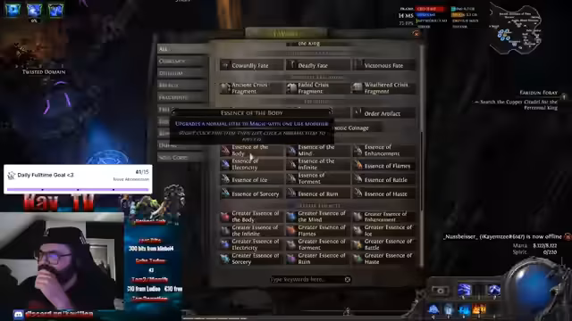 04:02:31Es wird sich über den drastischen Kursverfall der Exalted Orbs (Ex) von über 700 auf 510 innerhalb von drei Tagen beschwert und die Gründe dafür diskutiert. Spekulationen über die Ursachen werden angestellt, einschließlich der Möglichkeit, dass ein englischer Streamer alle Omen of Whistling aufgekauft hat, was deren Preis fast verdoppelt hat. Es wird überlegt, ob dieser Streamer etwas Neues im Spiel ausprobiert und dafür viele Divine investiert hat. Außerdem wird über den überarbeiteten Baum im Spiel gesprochen und technische Probleme mit den Grafikeinstellungen behoben. Es wird ein Giveaway von Divine veranstaltet und Viewer werden eingeladen, an Maps teilzunehmen. Außerdem wird die Frage diskutiert, wie viel Mana-Regeneration durch Spark erreicht wird und wie sich Corruption auf Items auswirkt. Minions verursachen Lecks und sollten vermieden werden. Es wird auch ein Blick auf das Build eines Zuschauers angeboten.