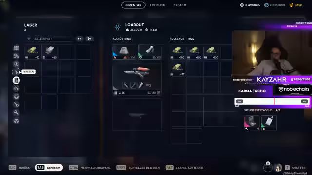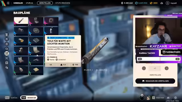00:53:28KayzahR löst technische Probleme bei der Tastaturbelegung, insbesondere bei der Erstellung von Hashtags. Er verwaltet sein Lager, indem er Baupläne und überflüssige Gegenstände verkauft, und priorisiert wichtige Baupläne wie El Toro und mittlere Waffenteile. Parallel dazu diskutiert er mit dem Chat über die Platzverhältnisse an seinem Schreibtisch und die Optimierung seines Setups.