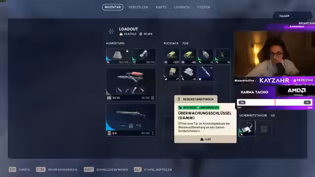 00:06:32KayzahR diskutiert mit anderen Spielern und ärgert sich über einen Spieler, der ihn camped. Er findet zahlreiche Blueprints und kritisiert die Qualität der Loot-Räume, insbesondere Keycard-Räume, die oft nur grüne Waffen liefern. Er bemängelt zudem die begrenzten Lagerplätze und die Tatsache, dass sein Lager ständig voll ist, obwohl er viele Gegenstände nicht verwendet.