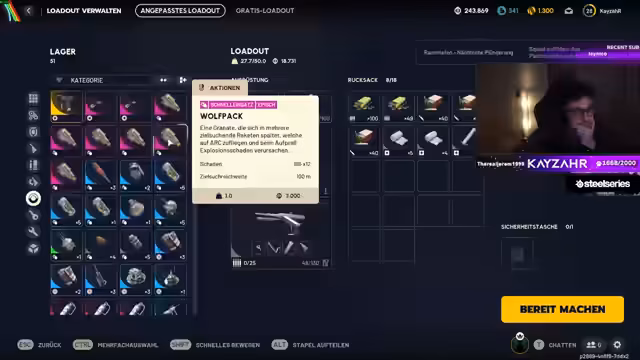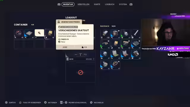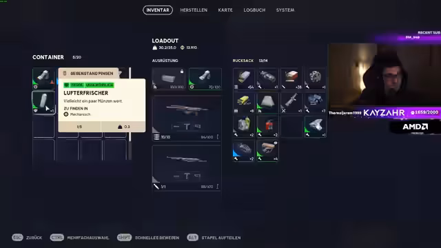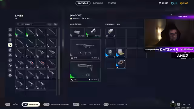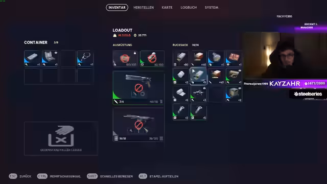 01:39:02Der Streamer beschäftigt sich intensiv mit der Verwaltung seines Inventars und der Ausrüstung. Er fragt die Zuschauer um Rat, wo er Kaktusfeigen finden kann, wobei zwei unterschiedliche Meinungen (Raumstation und Dammkörbe) genannt werden. Ein wichtiger Tipp für neue Spieler wird geteilt: Kostenlose Loadouts können nach dem Überleben einer Runde gegen eine Beutemarke getauscht werden, um so kontinuierlich Ausrüstung zu erhalten. Es wird auch diskutiert, welche Waffen verkauft oder recycelt werden sollen, um Platz zu schaffen, da das Inventar chronisch überfüllt ist. Insbesondere grüne Waffen sollen zerlegt werden, um Waffenteile zu gewinnen. Trotz maxed-out Inventarerweiterungen bleibt das Platzproblem bestehen, was zu Frustration führt und die Notwendigkeit des ständigen Aufräumens unterstreicht.