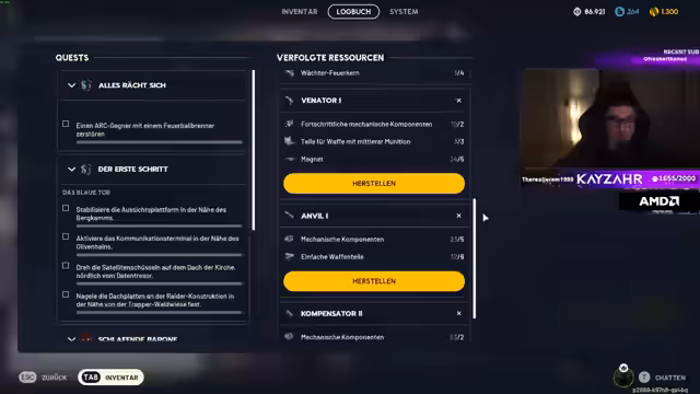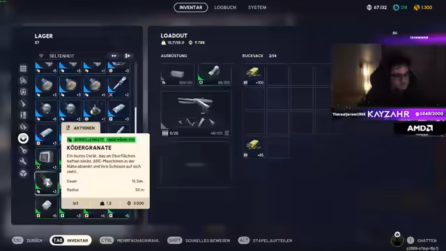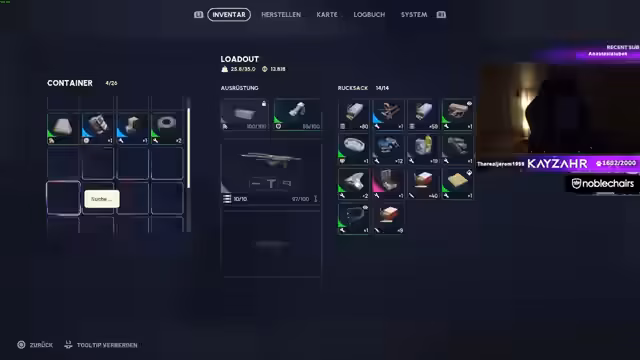 03:52:59Der Streamer freut sich über die hohe XP-Belohnung von 500 statt 200 pro geplündertem Teil des besiegten Gegners. Er muss sein Inventar managen und Verbände sowie Munition wegwerfen, um Platz zu schaffen. Er hat Hochleistungsstahl gefunden und ist erleichtert, dass der Kampf vorbei ist. Er bemerkt, wie eine Drohne, die bereits kaputt war, immer noch auf ihn geschossen hat, und nennt sie eine "Kamikaze-Drohne". Er fragt sich, ob seine Anvil kaputt gegangen wäre, wenn er sie nicht repariert hätte. Er findet sechs dieser Drohnen und versucht, unbemerkt zu bleiben. Er ist schockiert über die Intensität des Geschehens und wird von einem zweiten Gegner getötet, der ihn "triggert". Er ist frustriert über sein Pech und die Tatsache, dass der Gegner "rausgeht". Er beklagt sich über die "Fotze-Raketenkanone" und die geringe XP-Belohnung von 3.000. Er hat genug Material, um seine "Ausfassungsbank" zu upgraden und braucht nun PvP mit "gratis loadout". Er versteht nicht, wie er den zweiten Gegner getriggert hat, da dieser so weit entfernt war. Er muss eine "Barker" setzen, da der Kampf ein "Scam" war. Er braucht einen "Industrie-Akku" für ein Upgrade und bittet den Chat, darauf zu achten. Er dankt für einen Prime-Sub und erklärt, dass die Aufklärungsdrohnen auf ihn schießen. Er bewundert das "perfide Konstrukt der Maschinen" und dankt für einen weiteren Prime-Sub. Er sucht nach dem besten Loot bei der Sicherheitskontrolle, wo sich Militärautos befinden sollen, die aber bereits gelootet wurden. Er benötigt immer noch "Kakteen-Dinger" für seinen "Coachman-Prix" und dankt erneut für die Prime-Subs.