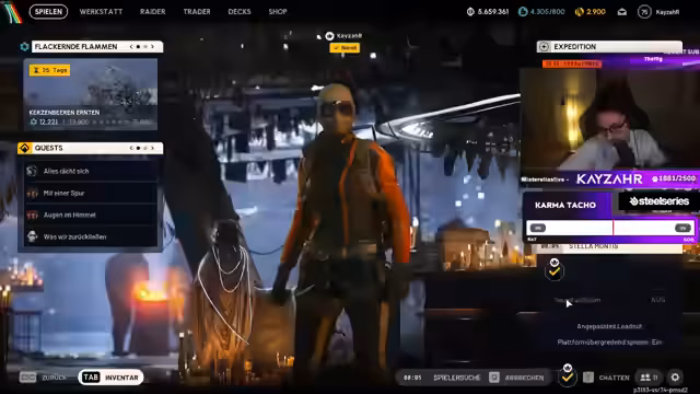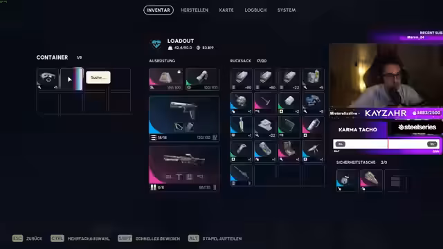 01:54:11Der Streamer trifft auf einen amerikanischen Spieler aus Kalifornien und begrüßt ihn mit einem "Greetings from Germany, motherfucker", was ihm Kraft gibt. Er ist misstrauisch gegenüber dem Spieler, da er befürchtet, dieser könnte ihn töten, aber sie kooperieren schließlich. Er sammelt Loot und ist überrascht von der Menge an Gegenständen, die er findet. Er überlegt, wie er sein Inventar am besten optimieren kann, und beschließt, alle seine "Bobcats" zu recyceln und die Aufsätze zu verkaufen, um unendlich viele "Venatos" bauen zu können. Er ist frustriert über sein volles Inventar und die "Scheiß-Inventar"-Verwaltung. Er plant, in den Veredler zu gehen, um einfache Waffenteile zu erhalten und Stahlfedern sowie Magneten zu kaufen, um Venatos zu craften. Er überlegt, ob er die Königin bekämpfen soll, ist aber unsicher, da er befürchtet, erneut von anderen Spielern getötet und ausgelootet zu werden.
