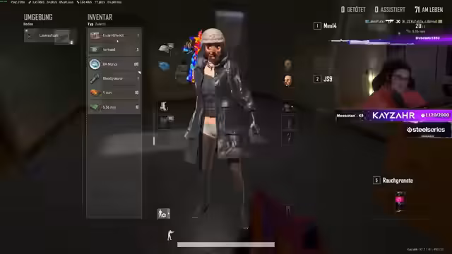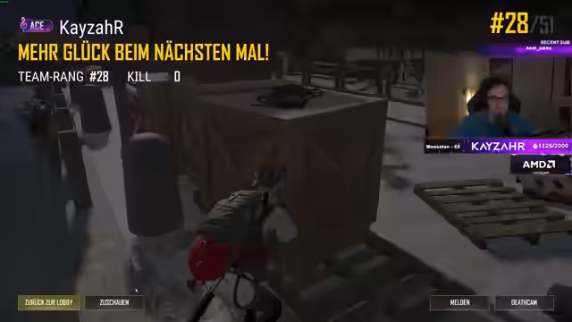 00:39:44Es wird vorgeschlagen, eine Runde im First-Person-Modus zu spielen, da es nicht schlimmer sein kann. Die COD-Erfahrung soll dabei helfen. Es wird befürchtet, dass das Looten noch langsamer wird. Die Schwester des Streamers mag das Outfit nicht. Der Streamer hat in den letzten 20 Matches eine KD von 0,2. Es wird bezweifelt, dass es in den Lobbys wirklich so niedrige KDs gibt. Der Nachteil im First-Person-Modus ist, dass man das eigene Outfit nicht sieht. Es wird versucht, eine bestimmte Stelle zu erreichen, aber es scheint nicht zu funktionieren. Eine bestimmte Map wird als "Strat-Map" bezeichnet. Es wird geplant, wo gelandet wird und dass dort viele "Geeks" hingehen werden. Das Auswärtstrikot von Dortmund wird als schlecht bezeichnet. Es wird auf einen einfachen Win gehofft. Es wird über eine Kanalwette diskutiert, die in ein paar Stunden stattfinden soll, wenn die Hoffnung besteht, unter die ersten 20 zu kommen. Es wird spekuliert, dass man Millionär werden kann, wenn man auf Ja setzt. Im Killfeed ist direkt ein Kill mit einem teuren Skin zu sehen. Es werden mehrere Teams erwartet.