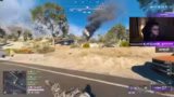 02:02:51Ein Helikopter ergreift die Initiative im Kampf. Er feuert Raketen auf den Streamer, der aber erfolgreich ausweichen kann. Ein Gegner versucht, per Raketenwerfer einen Panzer zu zerstören, was aber fehlschlägt. Währenddessen landet eine Waffenlieferung in der Nähe, die sofort von mehreren Teams umkämpft wird. Der Streamer schießt auf einen Lastwagen und versucht, die Waffe zu sichern.