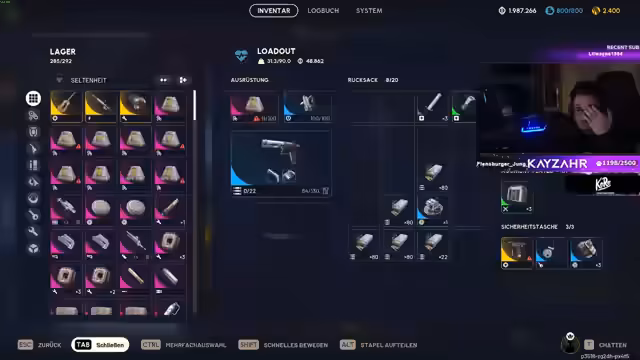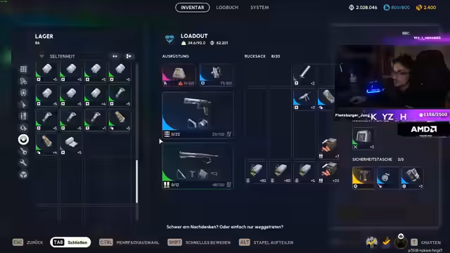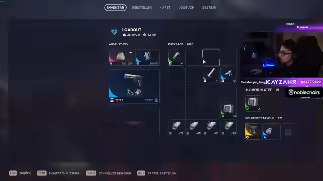 03:54:21Nach einem 'Massaker' sah sich das Team mit einem vollen Inventar konfrontiert, das es verwalten musste. Da das Ziel war, sich für eine Materialjagd umzubringen, war es nötig, Gewicht freizumachen. Der Streamer gab den Tipp, Waffen wie die Anvil zu zerlegen, um Waffenteile zu erhalten, ohne Gewicht zu verlieren. Gleichzeitig wurden Vorbereitungen für die Zombiesession um 21 Uhr getroffen. Man entschied sich, einen Kellerschlüssel und einen Lukenschlüssel mitzunehmen, um Abbau möglich zu machen. Die Map 'Blaues Tor' wurde als offen und schwierig für die Materialjagd eingestuft.
