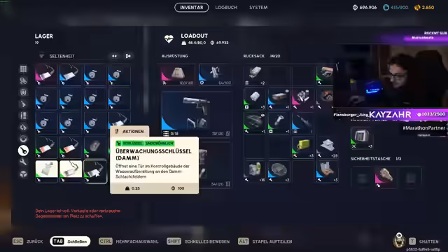 01:01:48Nach mühsamer und oft frustrierender Suche nach den letzten Quest-Gegenständen, insbesondere fünf Kabel und einem Tresor, gelingt es dem Streamer, die aktuelle Quest abzuschließen. Er freut sich über die daraus resultierende Erfahrungspunkte und geht dann die verbleibende Zeit im Stream durch seine Ausrüstung, um Platz im Lager zu schaffen. Er kündigt schließlich an, später auf den angekündigten Ersten-Weltkriegs-Shooter umzusteigen und hofft, dass seine Zuschauer Lust darauf haben. Er betont, dass dieses Spiel 'todeslustig' sei.