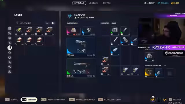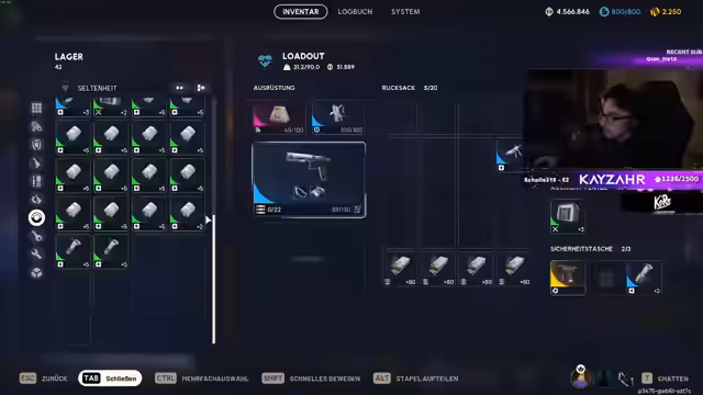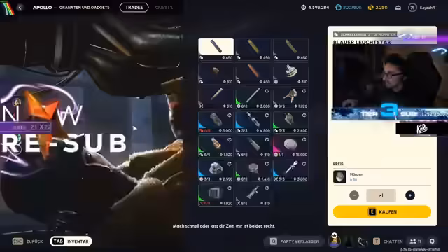 02:52:46Ein plötzlicher technischer Fehler unterbricht den Spielfluss. Der Streamer beschreibt einen Bug, bei dem sein Charakter sich nicht mehr bewegen kann und nur noch rollen kann, was ihn kampfunfähig macht. Es wird vermutet, dass dies mit einem benutzten Gegenstand (Snap-Hook) zusammenhängt. Der Streamer versucht das Problem zu lösen, indem er das Spiel neustartet, was jedoch nicht funktioniert. Auch das Wegwerfen von Gegenständen, um Platz zu schaffen, wird als Lösungsansatz probiert, was jedoch ebenfalls fehlschlägt und den Streamer frustriert.