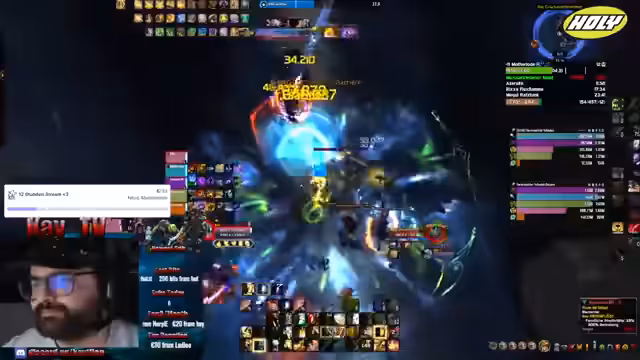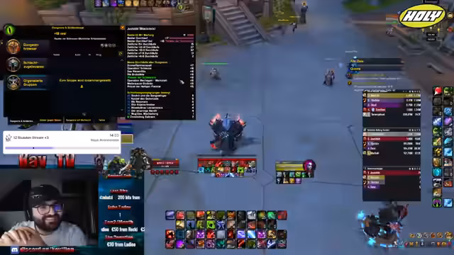 03:47:08Der Stream zeigt intensives Gameplay mit einem MOP Epic Edition Giveaway im Hintergrund. Der Streamer koordiniert die Gruppe, gibt Instruktionen zur Raiddurchführung und reagiert auf Game-Events. Er diskutiert Strategien gegen Feinde, betont die Wichtigkeit von Teamplay und kritisiert fehlende Fähigkeiten wie bestimmte Attacken oder Heilerleistung im Raid. Zwischen den Kämpfen gibt es humorvolle Kommentare und Anekdoten über andere Streamer und Raid-Erfahrungen.