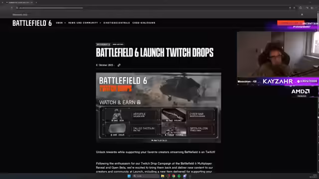 00:07:12Der Stream beginnt mit einer Begrüßung des Publikums. Es wird der offizielle Battlefield-Drop für Abonnenten angekündigt, der ab 17 Uhr startet und eine Woche läuft. Der Streamer klärt, dass sowohl ein eigener Sub als auch das Verschenken eines Subs für die Belohnung in Frage kommen und betont die Notwendigkeit, einen EA-Account zu verlinken, um die Drops zu erhalten. Zusätzlich wird ein Battlefield-6-Chat-Badge für Teilnehmer versprochen.