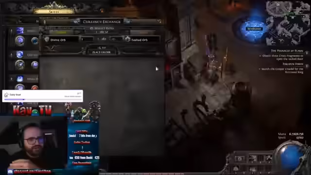 05:21:01Der Streamer beklagt den mäßigen Loot auf einer 'Big Map', insbesondere fehlen ihm die erwarteten Divine-Drops. Der Chat diskutiert die Wertigkeit von Rubinen, die nur vom Krieger-Skill relevant sind. Schließlich droppt doch ein Divine, gefolgt von einem zweiten Divine kurz darauf. Dies führt zu großer Freude, da die Map mit 187% Quantität durch Atlas-Effekte besonders profitabel ist.