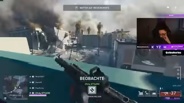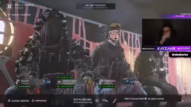 02:17:02Nach einem Game-Crash berichtet der Streamer von Bewegungsproblemen ('kann sich nicht bewegen'). Trotzdem setzt das Team die Runde fort und positioniert sich am Rand der Zone. Es folgen Kämpfe gegen mehrere Gegnergruppen, wobei die Drohne zur Zielmarkierung genutzt wird. Die Gruppe erzielt mehrere Kills, darunter einen One-Shot-Hit, und verwaltet Ressourcen wie Platten und Defibrillatoren. Diskussionen über die Notwendigkeit weiterer Kills und Punkte dominieren. In der finalen Phase rotieren sie vorsichtig, nutzen Deckungen und bereiten sich auf die nächste Runde vor, während technische Probleme weiterhin den Spielfluss beeinträchtigen.