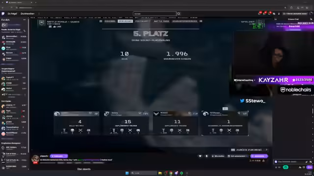 05:27:39Am Ende des Streams wird die Turnierperformance bilanziert. Das Team belegt Ränge wie 0-9, was als enttäuschend bewertet wird, trotz teilweise hoher Schadenswerte. Der Spieler merkt an, dass die Gruppenzusammensetzung schwierig war, mit Gegnern wie 'Lennon', 'Hans' und 'Prodigy EU'. Für den nächsten Tag plant man Änderungen, etwa den frühen Einsatz von Helikoptern, um schneller zu strategischen Punkten zu gelangen, und das Ziel, zumindest einen Kill pro Runde zu erzielen. Die Turnierstruktur wird thematisiert: Ein Schlangenverfahren soll die Gruppen für den nächsten Tag mischen. Der Spieler reflektiert über die eigene Leistung und drückt Hoffnung auf Verbesserung aus, insbesondere durch Teamanpassungen und Lernen aus Fehlern.
