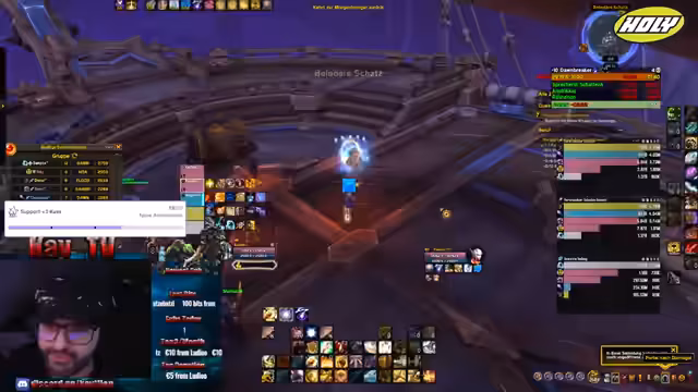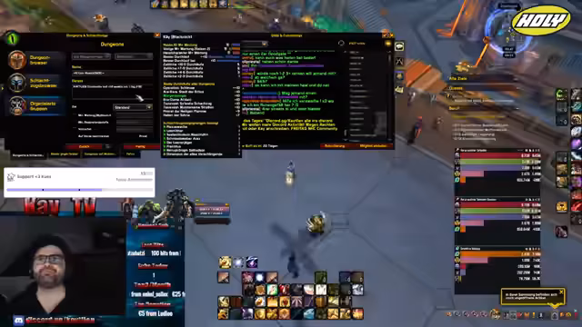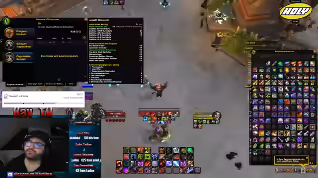 00:08:41Der Streamer initiiert die Bildung einer Gruppe für einen 10er-Schlüssel in World of Warcraft. Er sucht gezielt nach einem Heiler und bittet im Chat um Meldungen. Es werden verschiedene Charakterklassen und ihre Rollen diskutiert, wobei der Streamer sowohl einen Paladinentank als auch einen Retribution Paladin als Hauptcharaktere erwähnt. Die Bedeutung eines Twitch-Accounts wird betont, um im Chat interagieren und In-Game-Goodies zu erhalten.