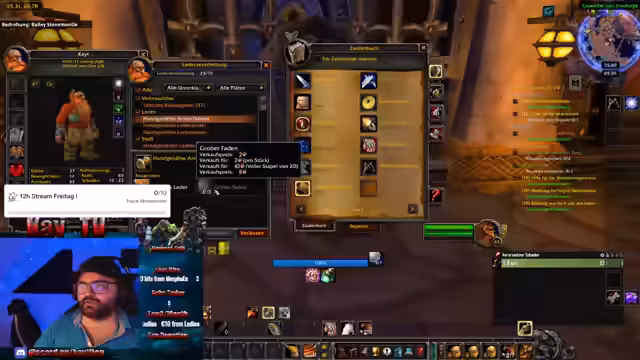 06:39:15Der Streamer bemängelt die mangelnde Aktivität im Gildenchat und ruft die Community auf, sich an Quests zu beteiligen. Er tauscht sich über Spielklassen aus und gibt Ratschläge für Tanks, wie z.B. den Druiden als die einfachste Klasse für Anfänger. Im Inventar herrscht volle Kasse, was das Fressen von Pets zur Notwendigkeit macht. Um Platz zu schaffen, wird alles verkauft, was nicht gebraucht wird, und der Fokus liegt auf dem Farmen von Gold und seltenen Items.