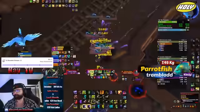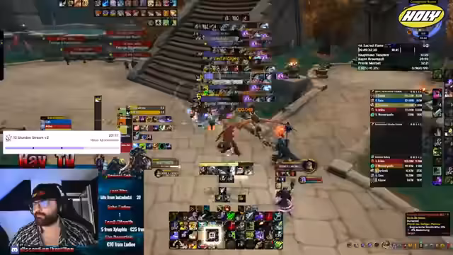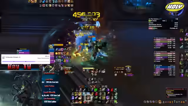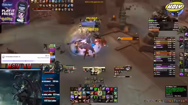04:24:56Während des Streams wird hauptsächlich im Metier (Meta) Schlüsseln (Keys) von World of Warcraft gespielt. Die Streamerin erprobt verschiedene Zusammensetzungen von Charakterklassen und ergänzt sich mit Chat-Teilnehmern, um die Erfolgschancen zu maximieren. Es werden spezifische Routen (Skips) und Taktiken diskutiert, wie zum Beispiel der Warlock-Skip. Es wird geplant, einen höheren Schlüssel zu erreichen, nachdem ein vorheriger Schlüssel erfolgreich beendet wurde. Eine Herausforderung ist das Auffinden geeigneter Heiler, insbesondere der Druiden, was oft zu längeren Wartezeiten führt. Es wird über die Notwendigkeit guter Schadensklassen und guter CC-Fähigkeiten (Crowd Control) gesprochen.