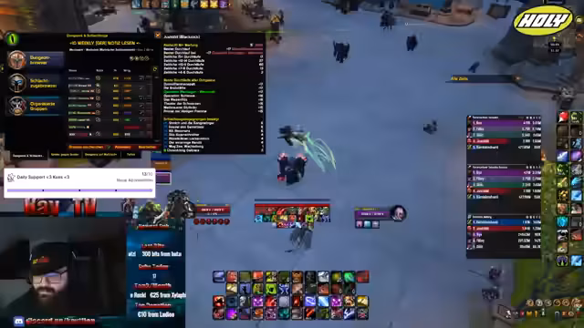 03:31:18Der Streamer sammelt aktiv Ideen für einen Schlachtzug von der Community. Er sucht gezielt nach Spielern, besonders einem Tank und weiteren Schadensverursachern für einen 10er-Schlachtzug in Motherloch. Er betont, dass das Spielen in der Community tausendmal besser ist als mit zufälligen Spielern und bietet an, seine Werkstatt für den Schlachtzug bereitzustellen. Es gibt einen Wettbewerb, wer die meisten Ideen beisteuert, wobei der Gewinner unterstützt wird.