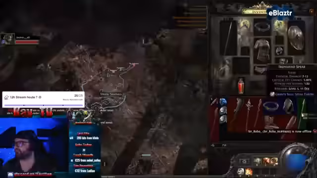 03:13:13Es wird überlegt, welche Skills als nächstes geskillt werden sollen. Der Streamer geht kurz pinkeln und etwas zu trinken holen. Es wird überlegt, ob Ausdauer geskillt werden soll. Die deutsche Übersetzung im Spiel wird kritisiert. Es wird über PC-Performance-Probleme diskutiert, während es auf der Konsole besser zu laufen scheint. Es wird überlegt, den Lootfilter anzupassen oder ganz zu deaktivieren. Der Zulli-Ring wird gefunden. Es wird erklärt, dass weiße Items für jeden Spieler sichtbar sind. Es wird ein Zuschauer begrüßt und ihm für seine Unterstützung gedankt. Es wird davon abgeraten, den Speer zu früh aufzuwerten. Es wird empfohlen, lieber für 400 Gold eine Gamble-Waffe zu kaufen. Es wird erwähnt, dass der Login-Server Probleme hat. Es wird ein Support-Gem ausgewählt. Es wird über Verbindungsabbrüche diskutiert. Es wird sich darüber gewundert, warum der Spark-Charakter keinen Schaden mehr macht.