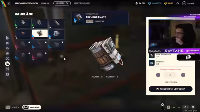 01:52:13Zu Beginn des Zeitraums arbeitet der Spieler an einer Quest, bei der es darum geht, einen Arc-Gegner und einen Feuerballbrenner zu zerstören. Er stellt fest, dass er bereits über notwendige Gegenstände verfügt und diskutiert die Anforderungen für den Bau von Trigger-Nades. Dabei erwähnt er konkret, dass er noch eine Bratpfanne und ein Musikalbum benötigt. Es folgt eine Auseinandersetzung mit der Lagerverwaltung: Er realisiert, dass ihm 130 Einheiten für eine Lagererweiterung fehlen und überlegt, ob er überflüssige Gegenstände verkaufen kann, um Platz zu schaffen. Hierbei geht es auch um das Crafting von Heilgegenständen und das Nutzen von Ernte-Events in 'begrabender Stadt' für Ressourcen.