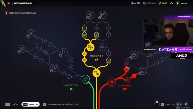 00:50:22Der Streamer erklärt detailliert seine aktuelle Skillbaum-Verteilung mit 29 Punkten in einer Kategorie, 27 in einer anderen und 20 in einer dritten. Plant, bestimmte Fähigkeiten auf Level fünf zu erhöhen, und bespricht die Möglichkeit, Skills später anzupassen. Bereitet sich auf eine Quest vor, bei der er zwei Arc-Gegner mit Explosionsgranaten zerstören muss.