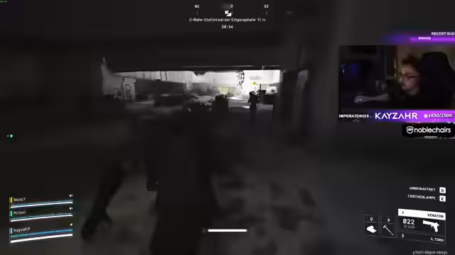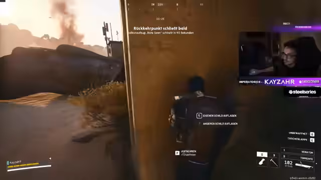 01:32:38Nachdem er den Tresor gefunden hat, wird der Streamer von einem Gegner, dem Bombardier, angegriffen. In der hektischen Flucht und dem Kampf bemerkt er plötzlich, dass die Gegner ihn markieren. Er geht davon aus, dass ihm nun mehrere Spieler nachstellen und die Situation gefährlich wird. Mit der wichtigen Ressource in der Tasche und einer angespannten Situation im Rücken endet der Stream abrupt mit dem Gefühl, gleich eliminiert zu werden.
