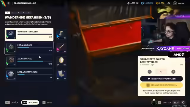 00:10:18Das Hauptziel ist das Sammeln von spezifischen Ressourcen für eine Expedition. Der Fokus liegt auf der Map Stella Montes, wo Pops, Zecken, Beobachtertresore und verrostete Bolzen gefarmt werden. Der Streamer erklärt die Tresore als große, leuchtende Objekte und beschreibt die Map Stella Montes als das beste Gebiet für diese Ressourcen, allerdings auch als PvP-intensiv und nicht immer angenehm zu spielen. Er farmt Zecken im Seed Vault und wünscht sich eine einfachere Methode zur Ressourcensuche.
