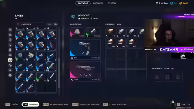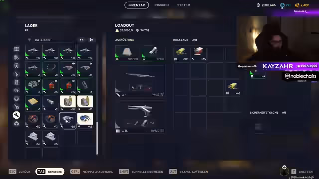 02:11:46Eine Runde neigt sich dem Ende. Der Streamer diskutiert im Chat, wie er seinen vollen Lagerplatz für die Zukunft nutzen könnte, z.B. durch das Weggeben von Ausrüstung an andere Spieler oder als 'Weihnachtsmann'. Er entscheidet sich, mit einem neuen Loadout, bestehend aus einer Benato 4, Granaten und Reparaturkits, zurück in das Spiel einzusteigen, um PvP-Aktionen zu erleben und seinen Platz im Lager weiter zu füllen.
