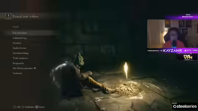 00:27:30Nach gescheitertem Run beginnt der Streamer einen neuen Versuch. Er ist erleichtert, einen Händler mit einer Laterne zu finden und kann somit dunkle Bereiche erkunden. Der Streamer analysiert sein Equipment, das trotz guter Lebenswerte eine schwache Waffe hat. Er fragt den Chat nach strategischen Tipps, welche Waffen er verwenden soll, und wünscht sich stärkere Bosse wie Radahn oder Malenia. Ein wiederkehrendes Problem ist, dass er die Angriffe mancher Gegner nicht blocken kann, was ihn in Schwierigkeiten bringt.
