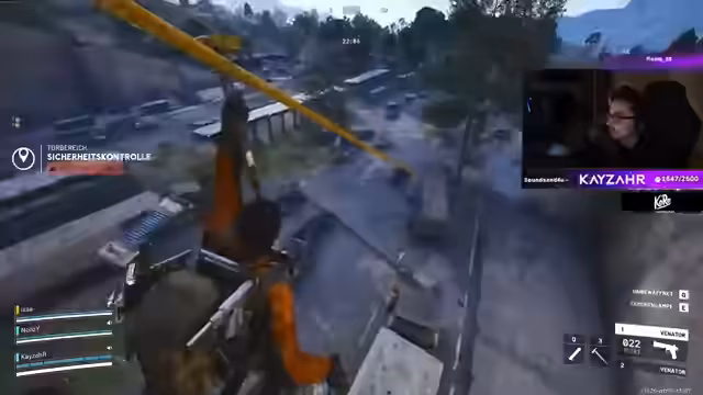 08:08:16Der Streamer erleidet beim Versuch, mit einem Snap Hook runterzuklettern, einen schweren Unfall und stürzt vom Dach. Er ist sichtlich frustriert und wundert sich über die Mechanik, die diesen Unfall verursacht hat. Er ist nun gefangen und kann seine Teamkollegen nicht erreichen. Er versucht verzweifelt, einen Weg zu finden, runterzukommen, und bittet seine Teamkollegen, ihm zu helfen. Trotz der verzweifelten Lage bleibt er humorvoll und drängt seine Teamkollegen, weiter zu kämpfen und den Feind zu eliminieren.