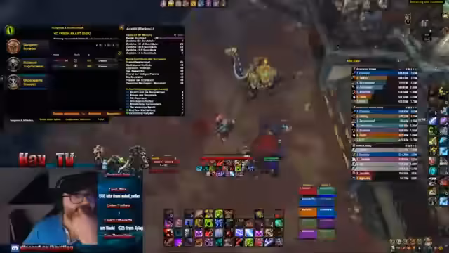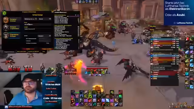 05:40:56Nach dem Erfolg beim vorherigen Boss, wechselt der Stream die Strategie für den nächsten Angriff. Die Mechaniken variieren, und es geht nun um das Balgen von 'Flamme', 'Bombe' und 'Blau'. Der Sprecher gibt klare Anweisungen zur Positionierung, wie 'Ranges auf links direkt gehen auf blau' oder 'Bombe reinpähen'. Er bemängelt auch mangelnde Konzentration ('blau ist zu langsam gestorben') und fordert das Team auf, sich stärker auf die 'weak aura' zu fokussieren. Das Ziel bleibt der schnelle, saubere Kill.