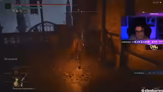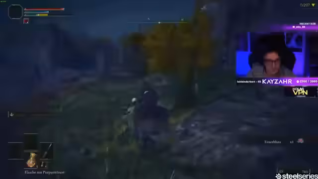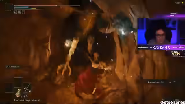 01:06:05Der Streamer erreicht den Boss 'Renala, Königin des Vollmondlichts'. Während des Kampfes in der zweiten Phase, 'Prime-Radahn', wird er vom Serienblut 'Scharlach-Fieber' getroffen, das ihn kontinuierlich schädigt. Ohne ein Heilmittel gegen diesen Status im Inventar verliert er alle seine Lebens-Tränke und stirbt an den folgenden Attacken, was den 'No Death'-Run beendet.
